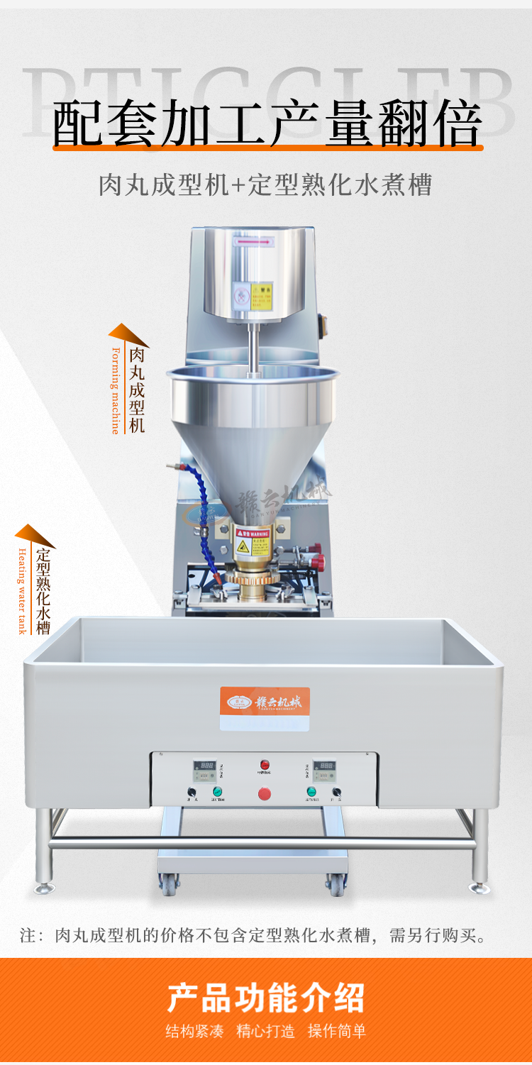 本款實心肉丸成型機是在120型實心肉丸成型機的基礎上加高設計,是配合我司設計的雙加熱水槽而設計,隨機配16、20、26MM三套成型模具,可做三種規格丸子,采用絞龍推料擠壓,切刀快速切割成型原理設計,每分鐘可成型約260個肉圓,圓度可調,是實心肉丸、魚丸、蝦丸、蟹丸、雞肉丸、素丸子等加工成型利器。