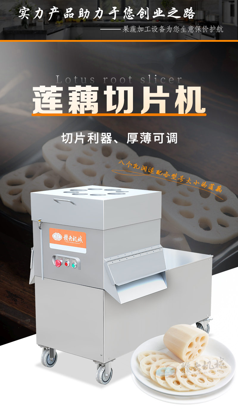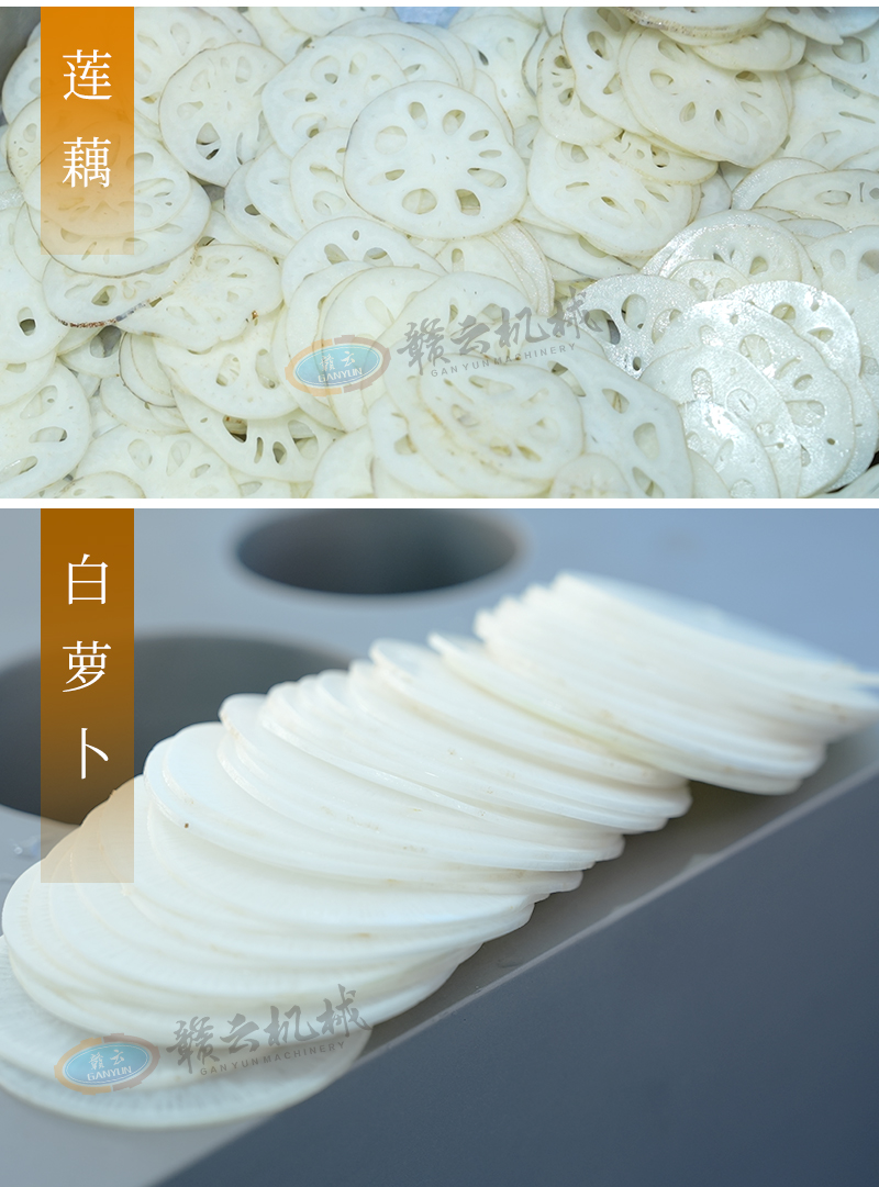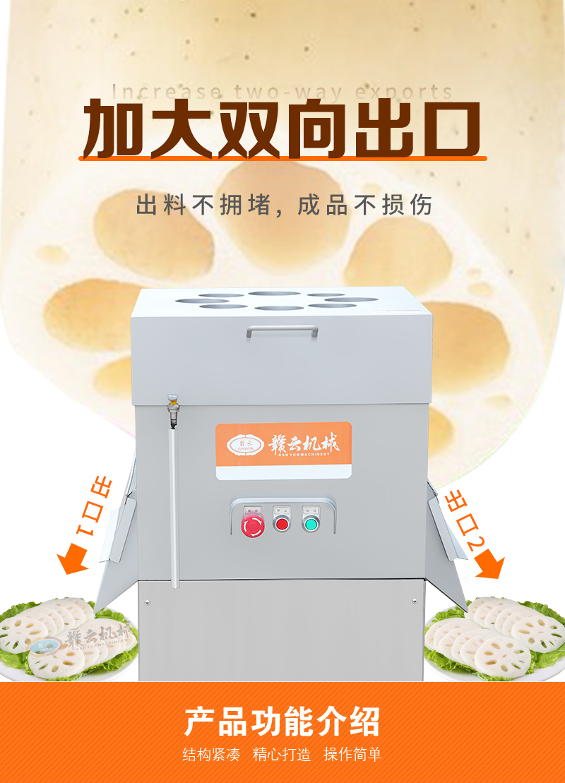 蓮藕切片機專為土豆、蓮藕、白蘿卜、檸檬、蘋果、胡蘿卜、西紅柿、獼猴桃等果蔬切片。采用下壓式設計,食品級不銹鋼材質,整體操作簡單,清洗方便,安全耐用。采用雙切刀進行切片,八孔入料設計,大大提升了切片效率。這款高效的蓮藕切片機,適用于商用廚房、中央廚房、營養餐供餐中心、食堂、食品廠等,幫助您快速完成各種水果或球根莖類蔬菜的快速切片加工。