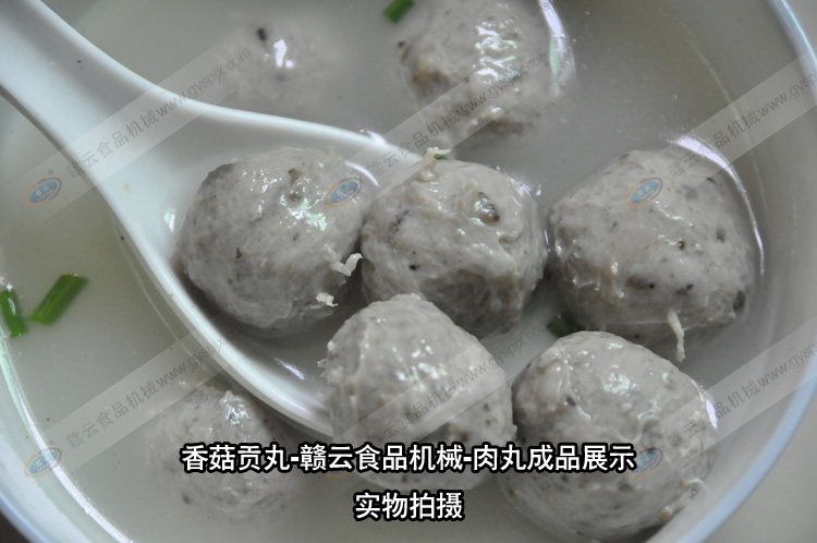 贛云食品機械肉丸成套設備的結晶,香菇貢丸,合作客戶獨家配方,用贛云牌肉丸設備制作的香菇貢丸,味美,有嚼勁,香菇原味,保證您吃了還想吃。香菇貢丸所需設備:自動絞肉機一臺,高速打漿機一臺,慢速打漿機一臺,食物切碎機一臺,貢丸機一臺,自動煮丸水槽一臺即可現做現賣,也可接單定做。相關設備的工作內容:自動絞肉機碎肉,高速打漿機將肉粒快速打成肉漿,慢速打漿機將肉漿調味,食物切碎機將香菇切成細小顆粒,放入慢速漿機中和肉漿一起調勻入味,貢丸機將肉漿成型貢丸,自動煮丸水槽將成型后的肉丸初步定型。批量的香菇貢丸就是這樣制作而成。