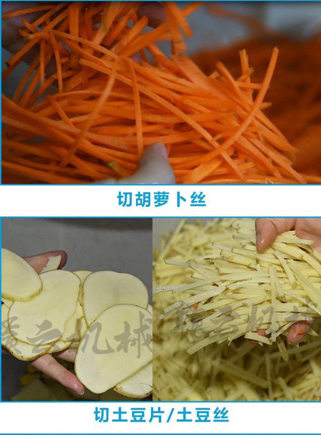 這臺切絲機的一臺多功能的切絲機切片機,土豆、胡蘿卜、茄子、苦瓜、西紅柿等等果蔬類都是使用,全不銹鋼材質,不易生銹、不易變形、全是水洗、而且大功率每小時500-800KG產量,一臺機器可頂七八個人工。