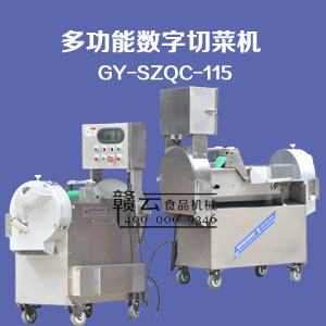 贛云果蔬加工設備網為你提供贛云牌數字切菜系列115型數字變頻切菜機,該機具有雙切菜機頭,大切菜機頭由變頻器控制段刀速度和輸送速度,適合切葉菜類蔬菜切段或條、絲、片等之用,通過段刀的轉動快速割斷的原理,段刀設計刀刃有弧度,利于割斷蔬菜,增長段刀使用壽命,段刀速度越快,切段長度越短,蔬菜切斷間距越薄;輸送速度變頻調節,輸送速度越快,切段長度越長,壓菜帶上兩端設計有平衡螺母,可調節壓菜帶兩端的水平平衡點,解決壓菜帶因物料的高低不均勻長期產生偏移故障,壓菜帶上端還設計有回位彈簧,控制壓菜帶的壓菜作用力,彈簧越緊,壓菜作用力越大,切菜時,蔬菜被壓的越緊。彈簧越松,壓菜作用力越小,蔬菜被壓越松。如切香蕉時,如果彈簧過緊,香蕉在沒有被切的情況下就被壓菜帶壓扁了;如果彈簧壓力適中,香蕉經過輸送帶和壓菜帶安然無事,能被段刀切出平整的切口。