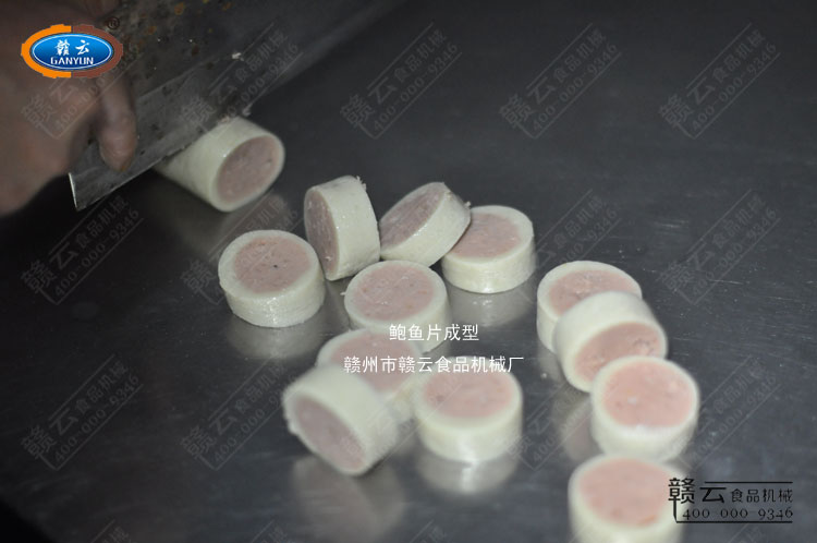 3、鮑魚棒成型:一臺泵浦灌腸機灌漿,一臺泵浦灌腸機灌肉餡,都連接鮑魚片成型工具成型鮑魚棒,通過加熱水槽定型熟化,再由切菜機切斷成鮑魚片。