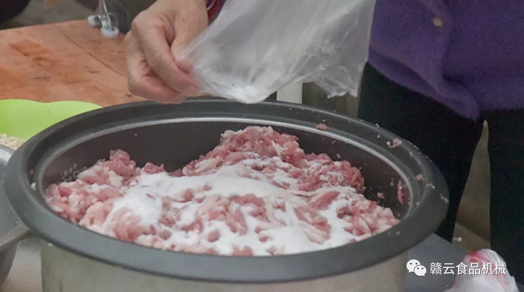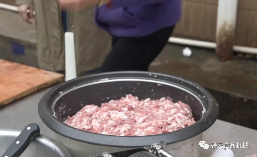 特別提示:拌制時要控制攪拌質量,加大原料肉和調料的混合攪拌,確保調料和原料肉拌制均勻,避免灌腸前原料肉上仍有調料干結小結塊。
