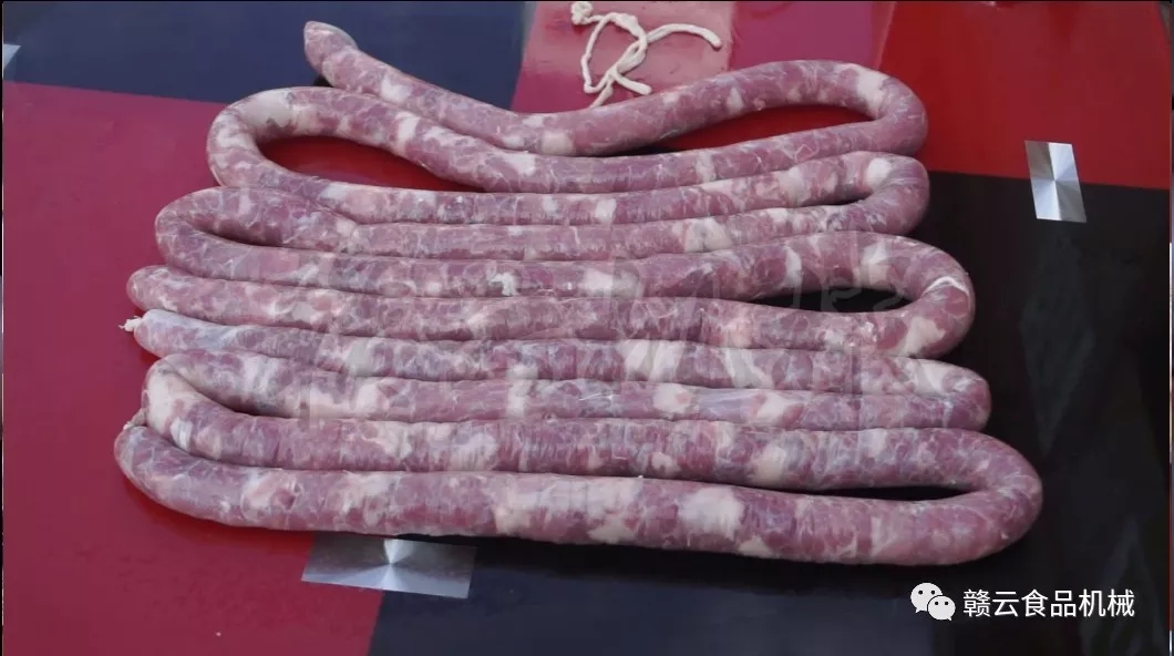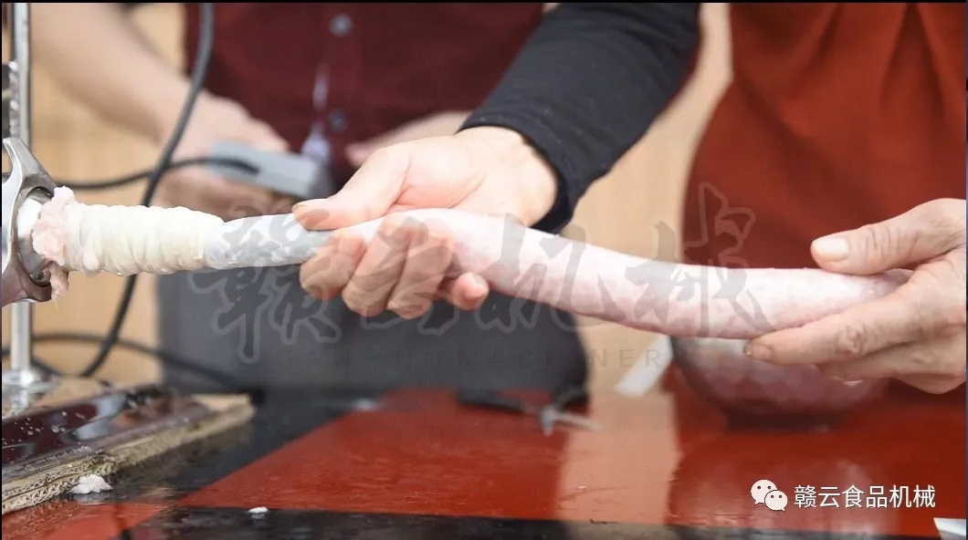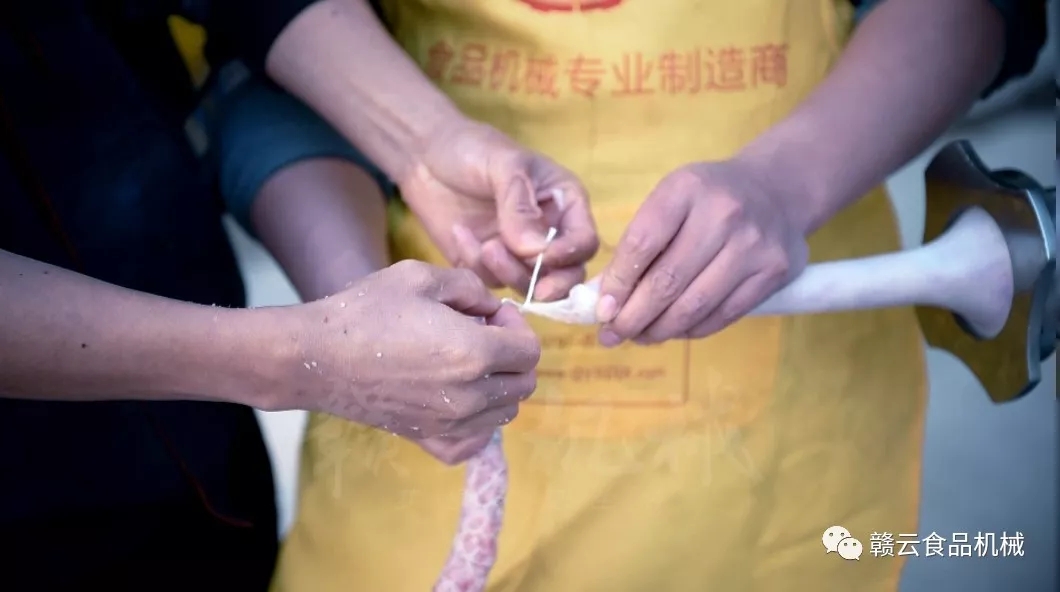 ③當出現腸衣破損時,要將其從破損處切掉扎口,將溢出的肉放入機器重新灌制;