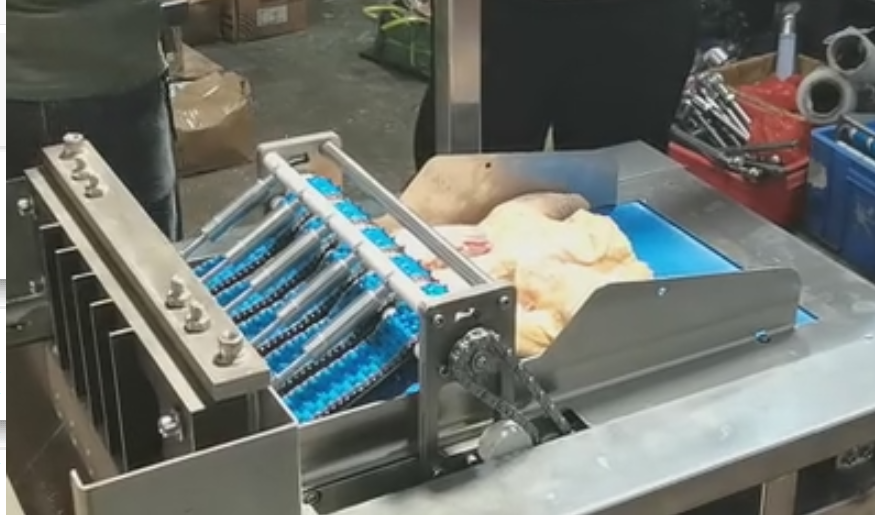 應(yīng)客戶需求(將-3攝氏度左右的整雞切成塊),今天客戶交了試機(jī)材料費(fèi)后我們就去市場(chǎng)買好了凍雞進(jìn)行試機(jī)效果拍攝。