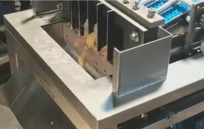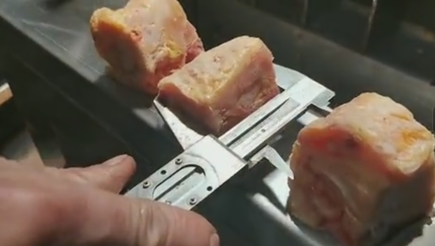 把雞肉放到傳送帶上,通過刀的時(shí)候可以看出切割雞肉非常迅速穩(wěn)定,大小也均勻。