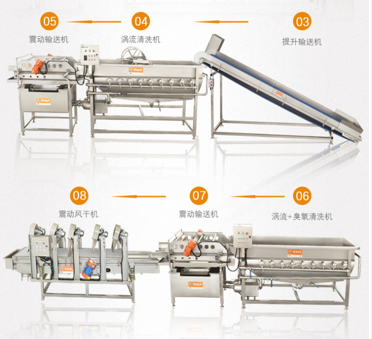 渦流振動清洗機采用螺旋狀混合水流清洗物料,高頻振動噴洗過濾,以延長清洗路徑,節約水源。二次沉淀過濾水循環系統,高效節能。機體內設有臭氧發生器,高效降解果蔬殘留的化肥、農藥等有毒物質,清除化學添加劑、激素等有害物質,殺滅海鮮中容易引起中毒的嗜鹽性菌等,以保證物料的鮮度。